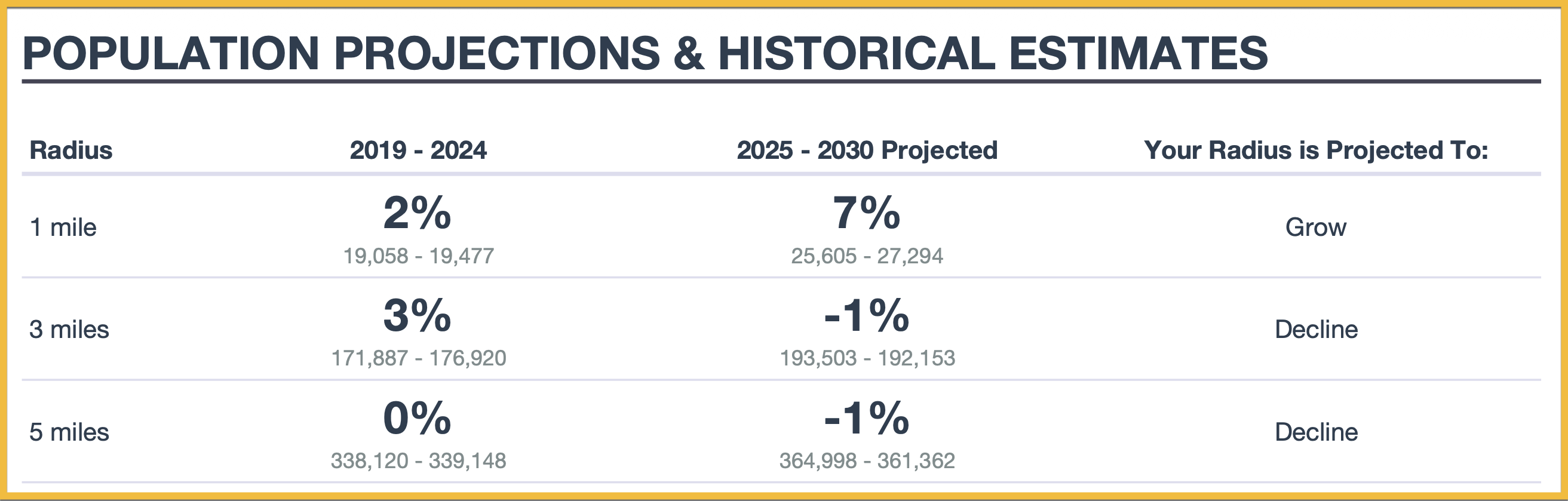 You’ll get a concise overview of population changes around your location, with historical data from 2019 and 2024 from the U.S. Census Bureau, alongside projections for 2025 and 2030 from Applied Geographic Solutions. You'll see percent changes for your radii reflecting growth trends. It's a straightforward way to visualize the expected population changes in your target area — all in one easy-to-understand table.
